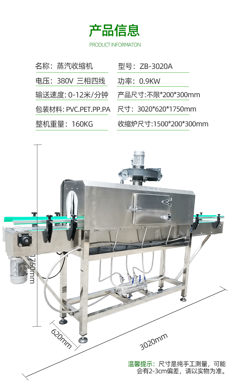 節能環保特點:通過精確的蒸汽控制和高效的隔熱措施,機器在保證良好收縮效果的同時,能夠有效節約能源。與一些傳統的包裝方式相比,蒸汽收縮包裝減少了包裝材料的浪費,并且蒸汽可以循環利用,降低了生產成本和對環境的影響。