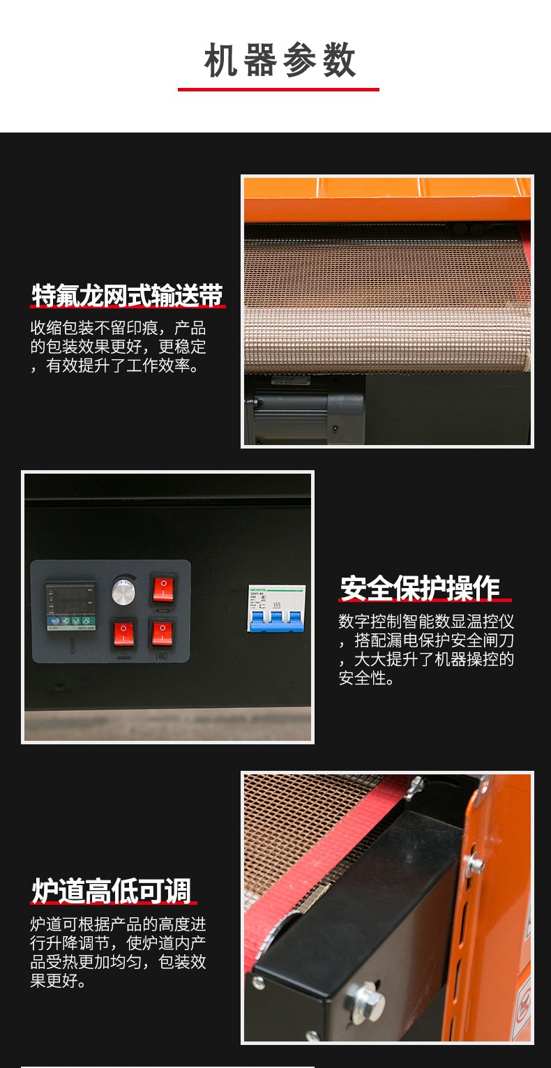• 精準(zhǔn)溫度調(diào)節(jié):配備了先進(jìn)的溫度控制系統(tǒng),可以精確地調(diào)節(jié)熱空氣的溫度。操作人員可以根據(jù)不同的薄膜材質(zhì)和產(chǎn)品包裝要求,在較寬的溫度范圍內(nèi)(通常為 100 - 250℃)進(jìn)行設(shè)置。例如,對(duì)于 PVC 薄膜,一般將溫度設(shè)置在 140 - 160℃之間,就能實(shí)現(xiàn)良好的收縮效果;而對(duì)于 POF 薄膜,溫度可能需要調(diào)整到 160 - 180℃左右。這種精準(zhǔn)的溫度調(diào)節(jié)有助于優(yōu)化包裝質(zhì)量,避免因溫度過高導(dǎo)致薄膜破裂或溫度過低使薄膜無法充分收縮。