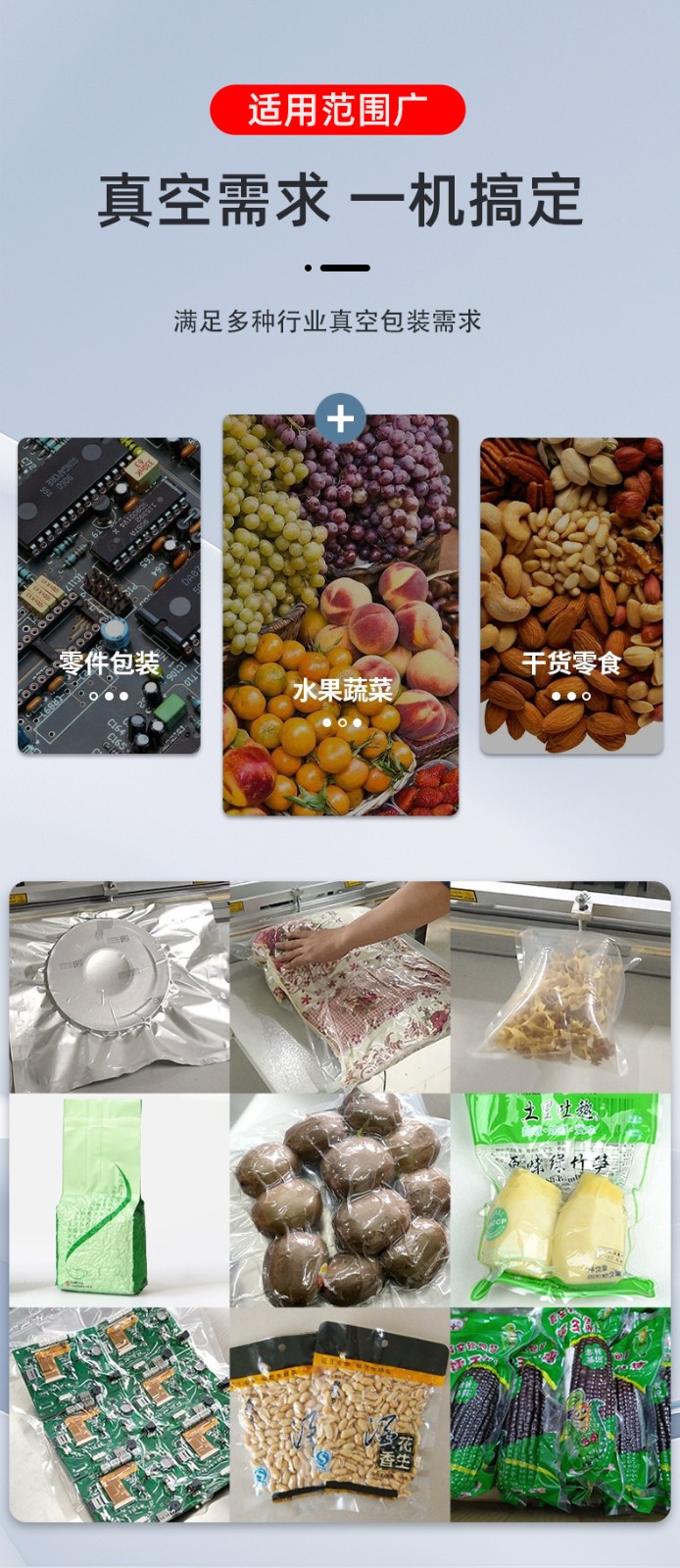 - 工業(yè)領域:可真空包裝大型機械零件(防銹)、整箱電子元件(防塵),部分機型支持調(diào)節(jié)抽真空力度,避免損壞精密組件。
