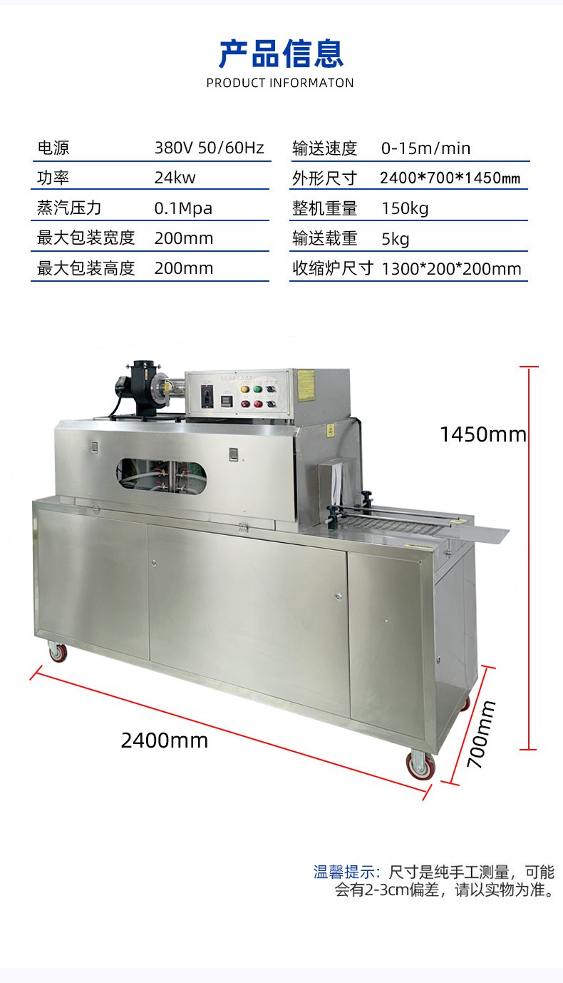 減少設備占用空間,適配多場景布局需求傳統蒸汽收縮包裝方案中,獨立蒸汽發生器體積較大,需與收縮機分開放置,還需預留管道連接的空間,整體占地面積大,對廠房面積較小的中小企業或生產線布局緊湊的場景極不友好。而蒸汽收縮一體機通過結構優化,將蒸汽發生模塊內嵌于設備主機框架內,采用垂直分層或側置內嵌的緊湊設計,整體占地面積相比 “分體式設備組合” 減少 30%-50%。這種集成化設計不僅能輕松適配車間狹窄區域、流水線嵌入式工位,還可靈活移動至臨時包裝作業區,無論是固定生產線還是臨時加工點,都能高效利用有限空間。