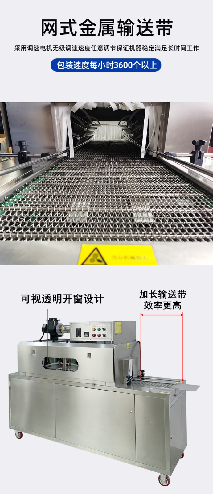 - 輸送系統:用于將待包裝的產品輸送到蒸汽收縮區域,常見的有輸送帶、輸送鏈條等,材質多為不銹鋼或其他耐高溫、耐腐蝕材料。