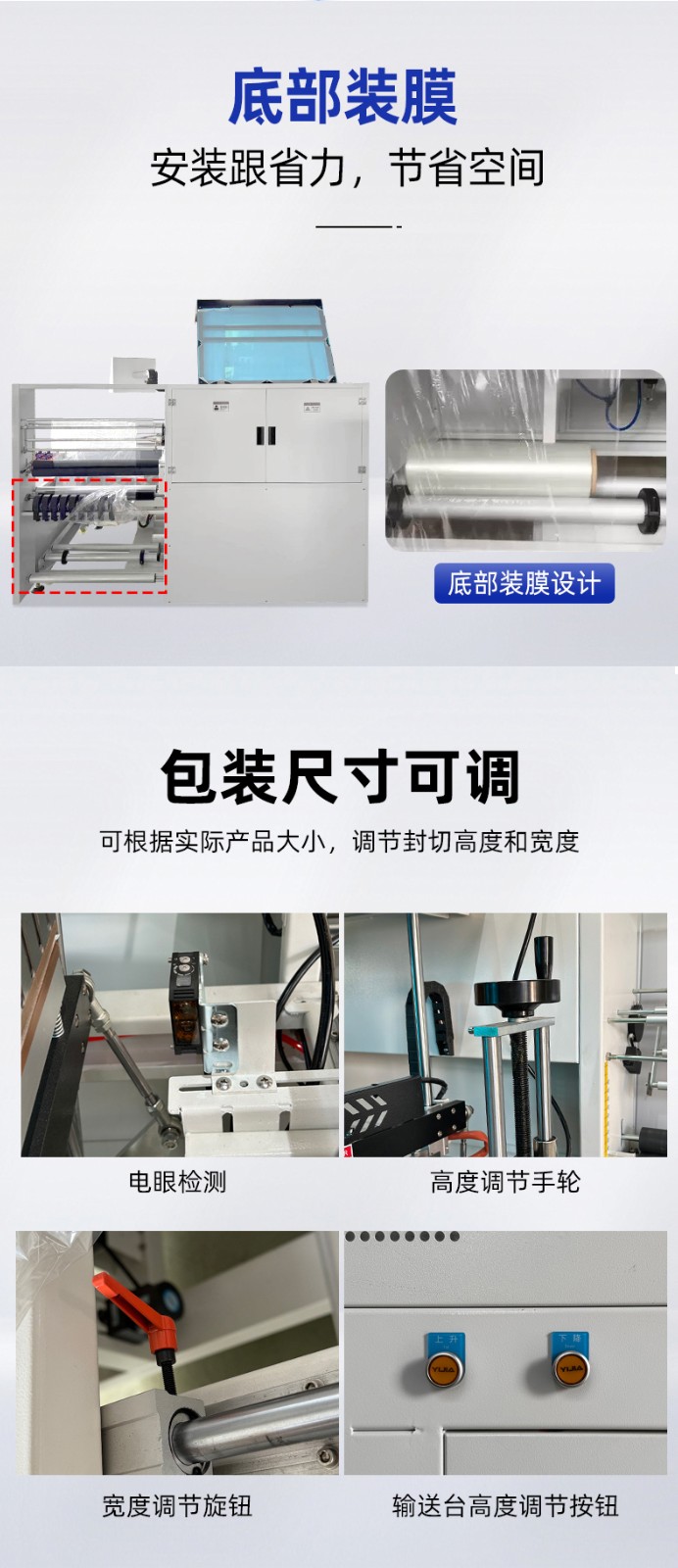 適用范圍廣:通過加裝水平及垂直兩組電眼,可輕松完成薄或小的包裝物的封口包裝作業,也可通過調整封刀高度適應不同高度產品的包裝。