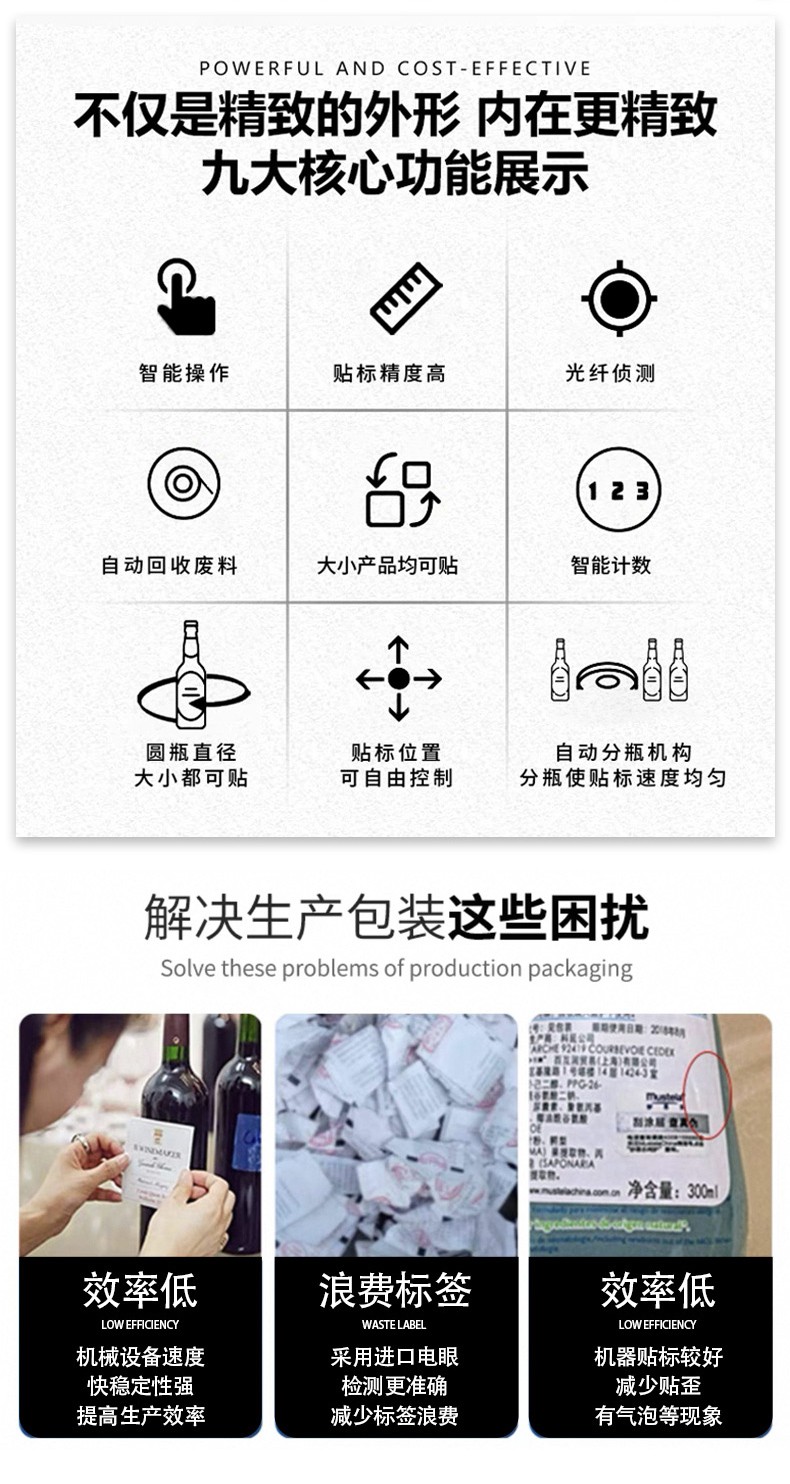替代人工,降本提質(zhì):避免人工貼標(biāo)歪斜、起泡、效率低等問題,穩(wěn)定貼標(biāo)質(zhì)量,降低單位成本,提升產(chǎn)品包裝美觀度與競(jìng)爭(zhēng)力。