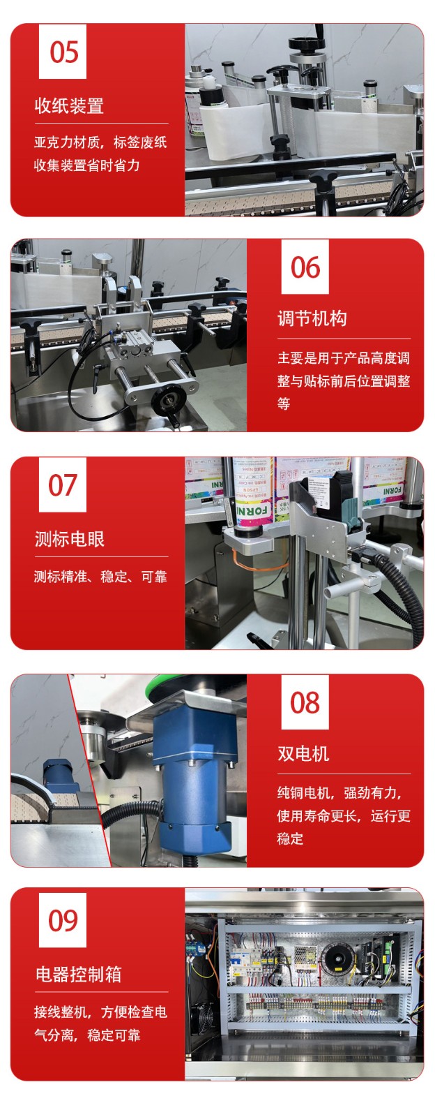 - 貼標:當圓瓶到達貼標位置時,貼標機構的標簽牽引裝置根據預設的標簽長度,將標簽從標簽卷上牽引出來,貼標頭在控制系統的指令下,將標簽準確地貼附在圓瓶表面。同時,壓標裝置對標簽進行壓實,使其牢固地粘貼在瓶身上。
