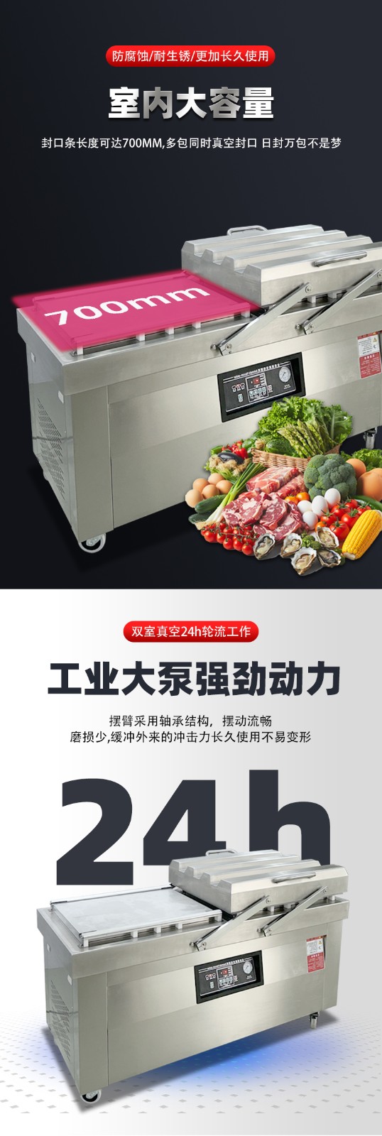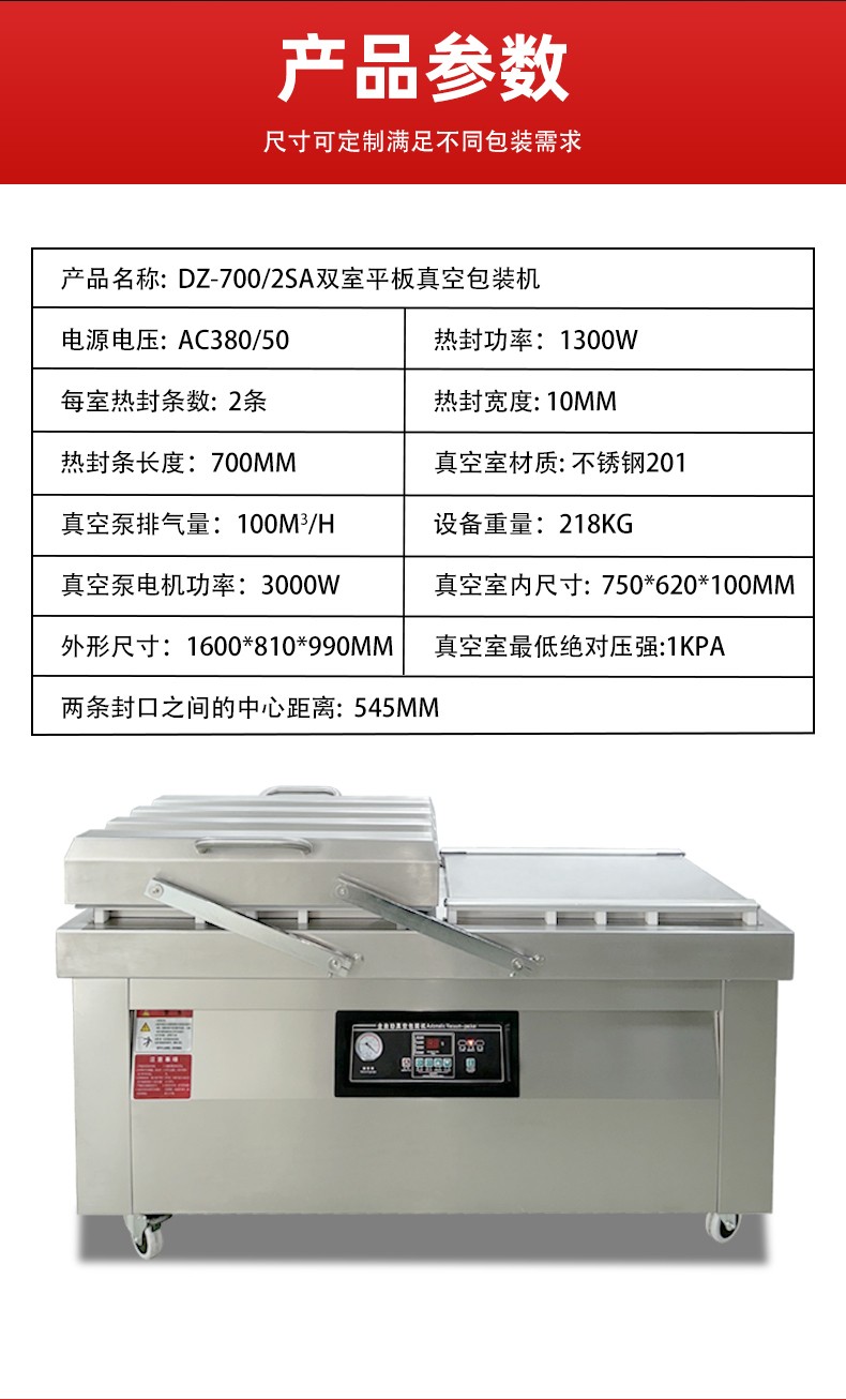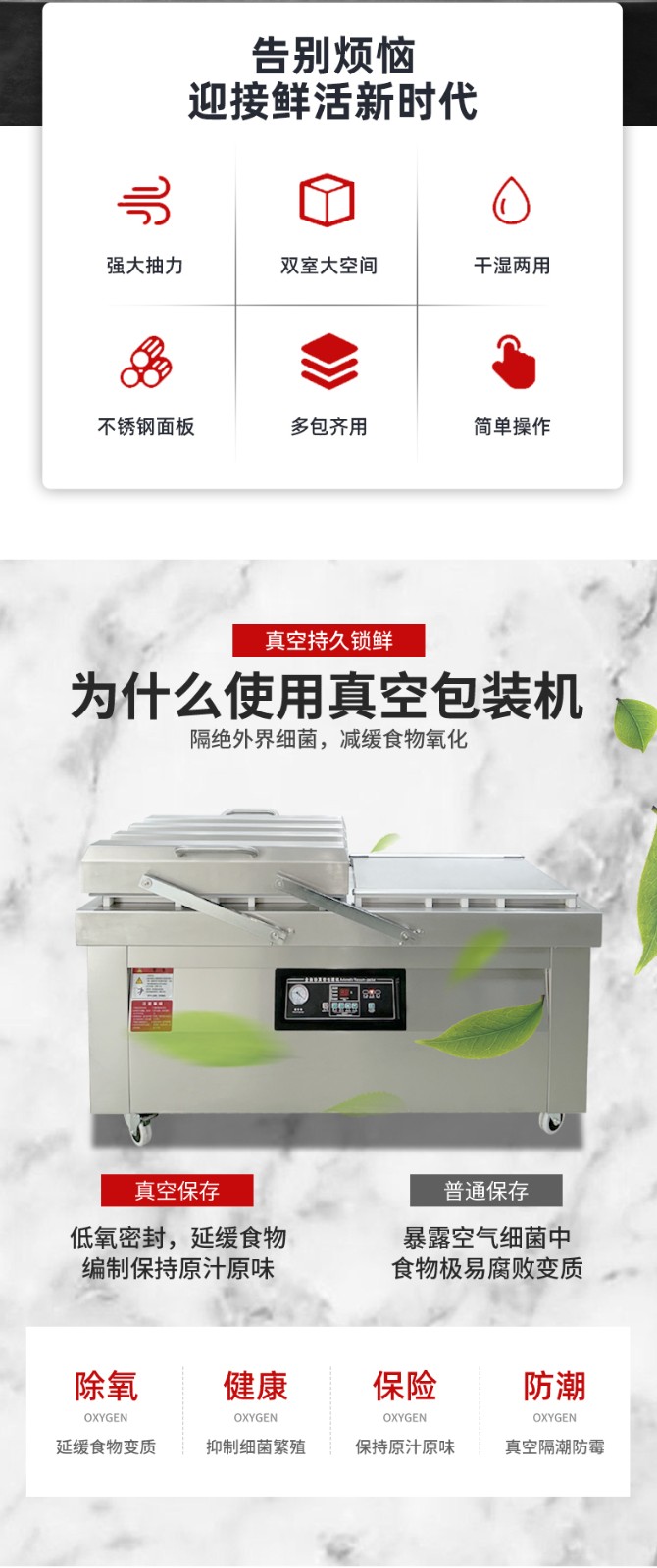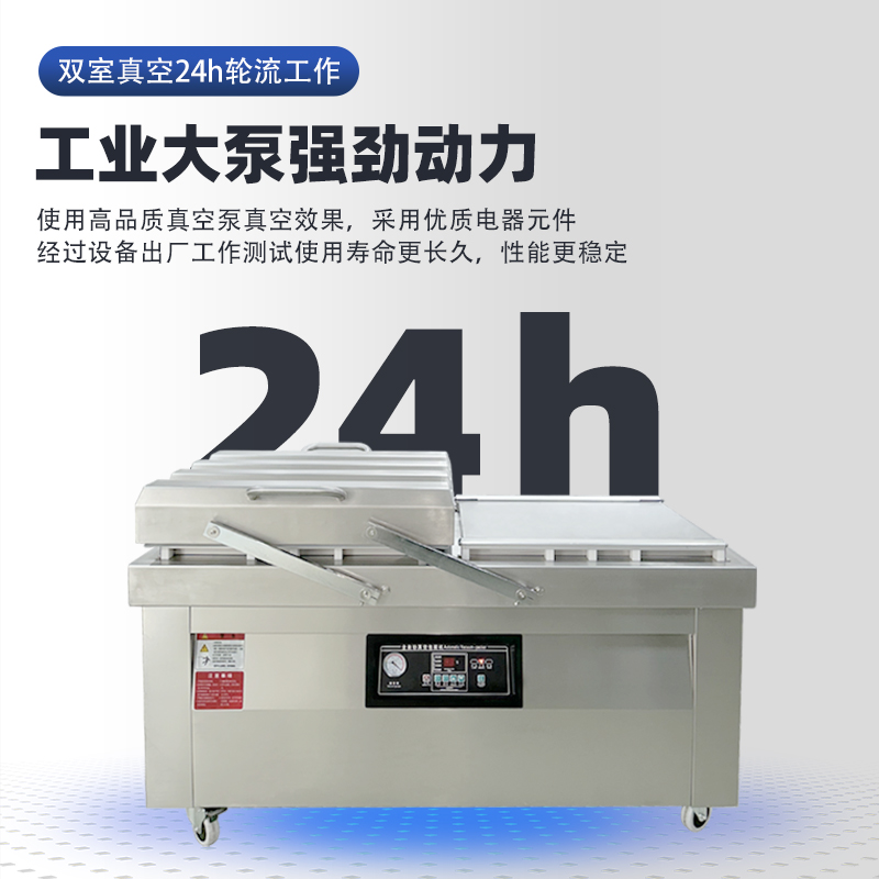 雙室真空包裝機通過 “雙真空室輪換作業” 實現抽真空與裝袋無縫銜接,核心是利用兩個獨立真空室的 “時間差并行操作”,讓設備在同一周期內同時完成 “抽真空密封” 和 “人工 / 自動裝袋”,徹底消除單室機型 “抽真空時無法裝袋” 的等待間隙,大幅提升作業效率。其具體運作邏輯和優勢可拆解為以下 3 點:
